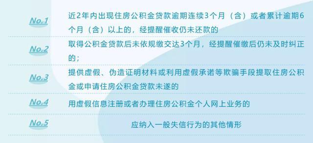 至于个人严重失信行为则为,近2年内出现住房公积金贷款逾期连续6个月(含)或者累计逾期12个月(含)以上的,经提醒催收仍未还款的;