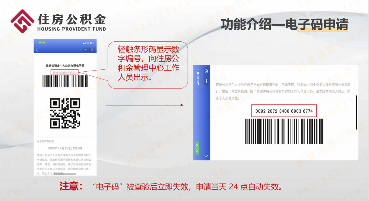 2.电子码使用:缴存人持电子码至中心柜台→工作人员在业务系统“亮码可办”菜单中输入电子码编号及职工信息→打印凭证并向职工出具。